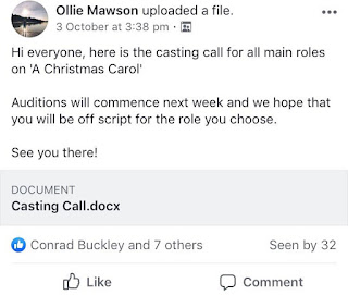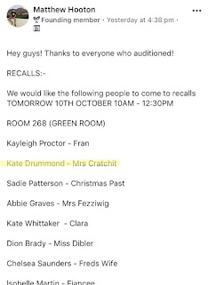 After coming home and waiting for the feedback from the audition, I saw in the Facebook group that a recall list had been posted. My recall was for Mrs Cratchit which I was buzzing with. Obviously, it was a shame that I didn't suit the role of the Christmas Past but I knew before the audition that it was risky for me to audition with a cockney accent. I learned my lines through the night and next morning and auditioned for Mrs Cratchit in scene 19 today. Immediately, I felt much more at ease when performing as Mrs Cratchit. I don't know why but I felt more suited to the role. Tom was telling me in the recall how he was looking for someone different for the role of the Christmas Past as he envisioned that role with a softer accent which, of course, was absolutely no problem at all. I thoroughly enjoyed the audition and I'm excited to hear the final roles.